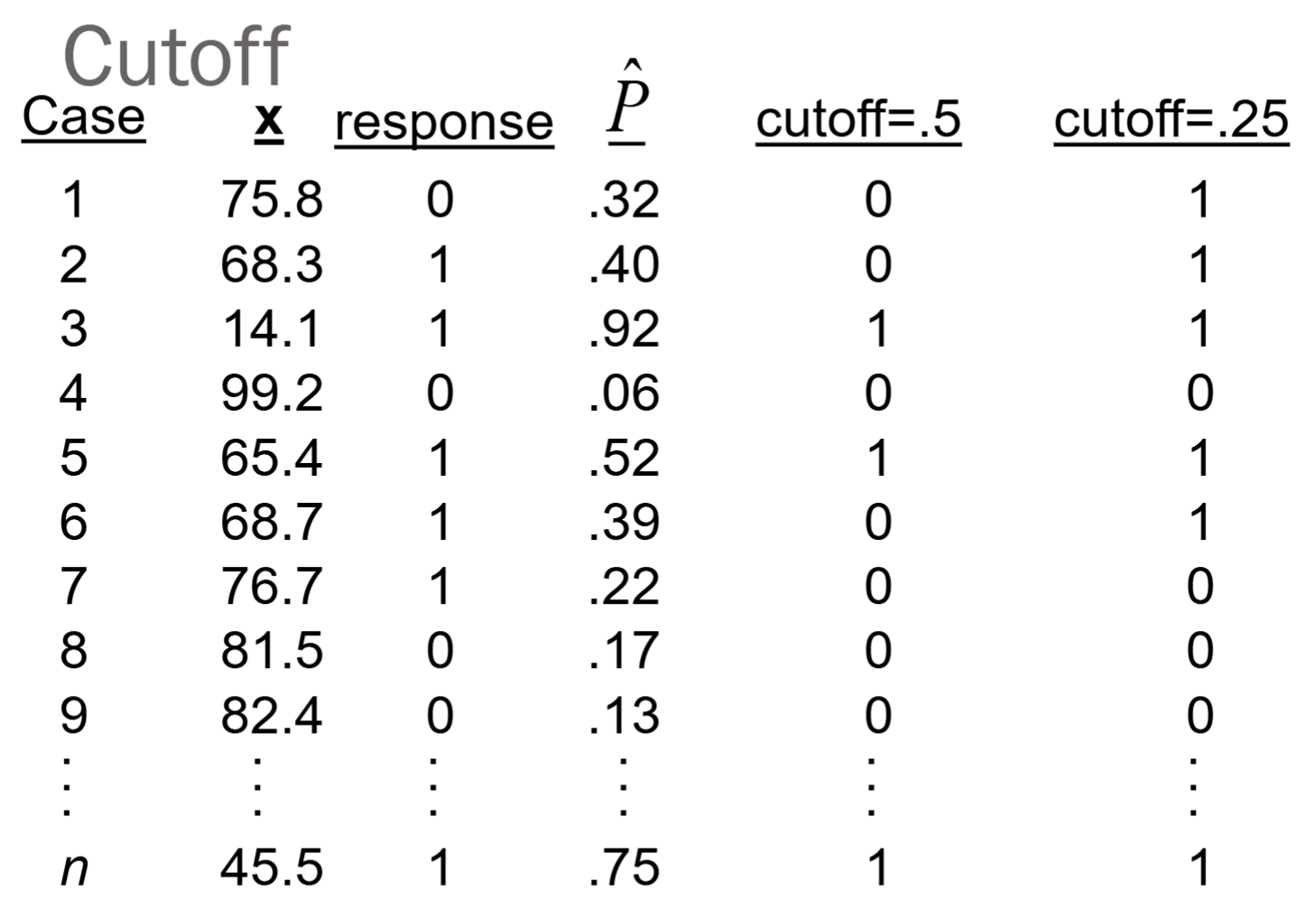 In this section, we focus on logistic regression with a binary response variable, 0 or 1. To predict the response variable using logistic regression, we need a threshold/cutoff value between 0 and 1. This is because the logistic regression provide only the probability of success at a given x.