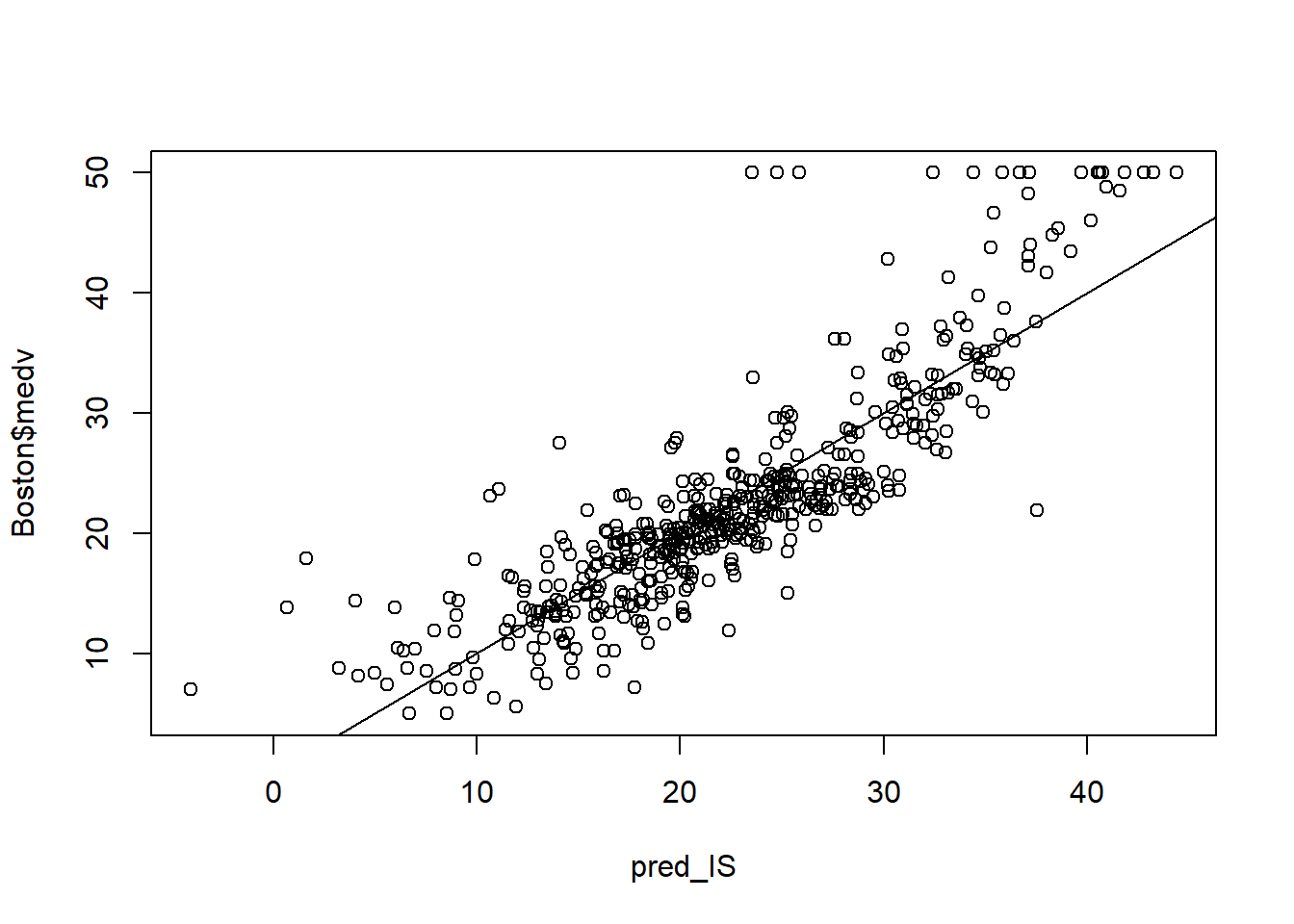 pred_IS <-predict(lasso_fit,as.matrix(Boston[, names(Boston)!='medv']),s = cv_lasso_fit$lambda.min)plot(pred_IS, Boston$medv)abline(a =0, b =1)