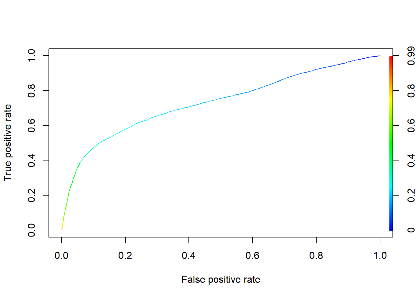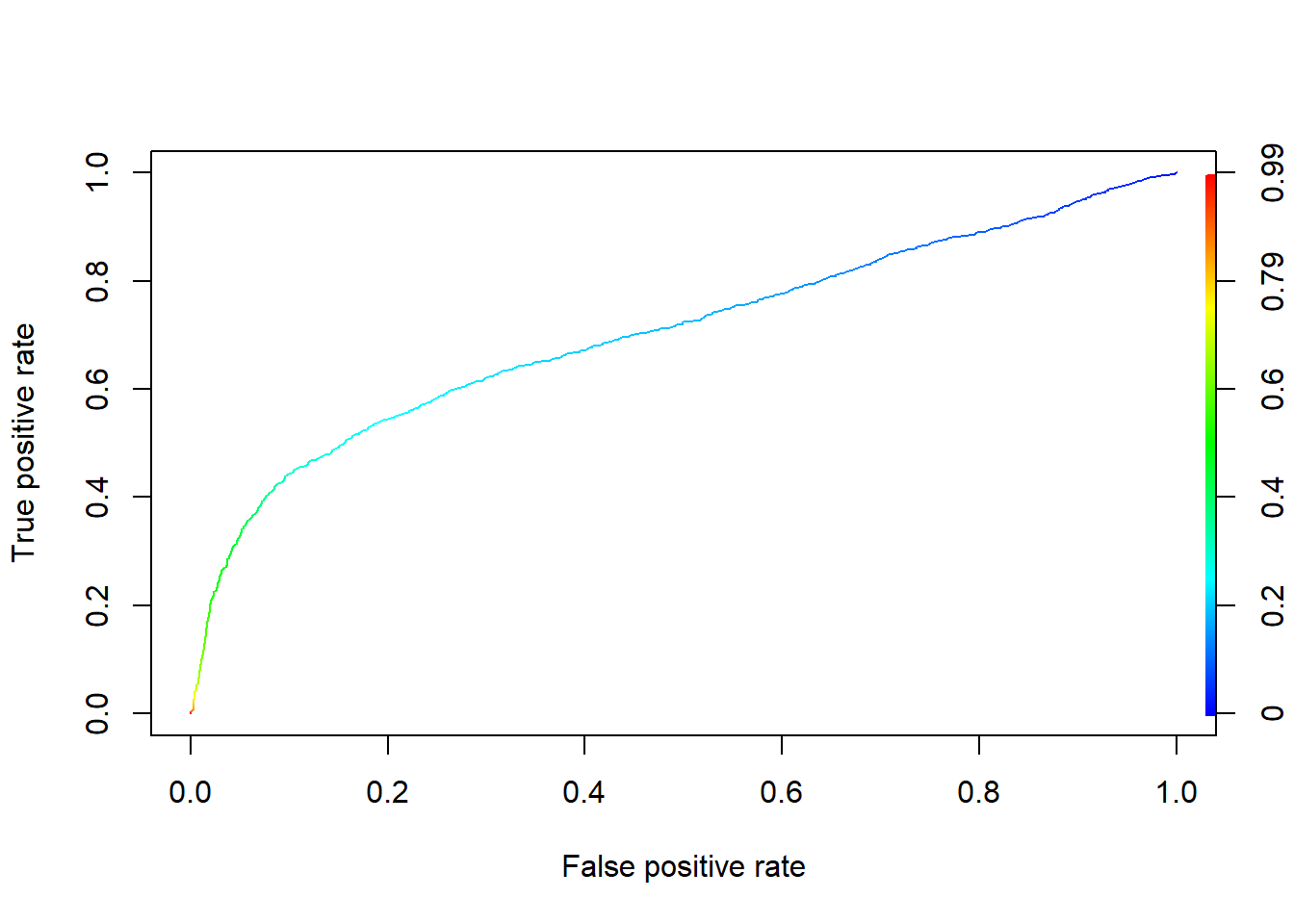 To evaluate the ROC curve, we usually use the area under the curve (AUC). A rule of thumb (industry standard) is that AUC > 0.7 represents acceptable discriminatory power.